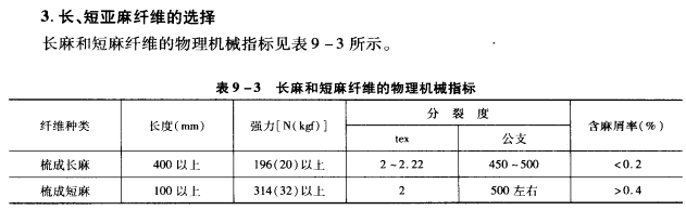 (3)涤纶的线密度:涤纶的线密度与亚麻纤维漂练后的线密度应相近。亚麻纤维漂练后的线密度为5—6.67dtex(1500—2000公支)左右,可选用2.78—3.33dtex(2.5—3旦)涤纶与亚麻纤维混纺,选用2.78—3.33dtex(2.5—3旦)涤纶对提高成纱品质有明显的效果。涤纶的长度与混纺纱线的规格见表9—2所示。