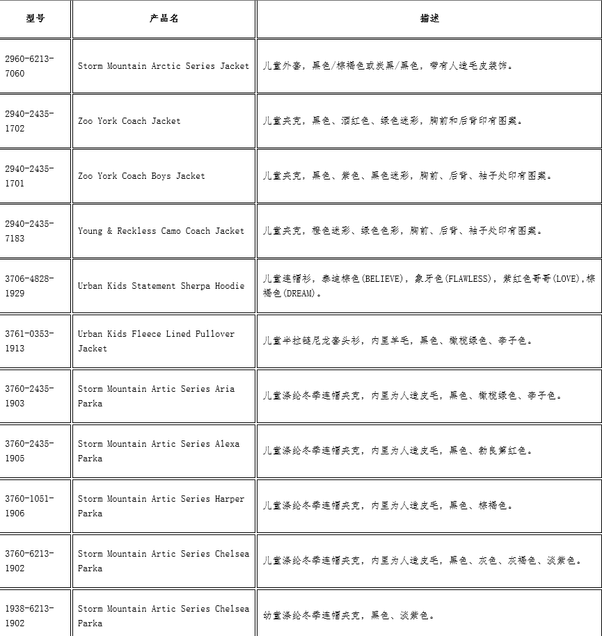 此次召回产品为儿童外套,帽子或腰部有拉绳和扣子。具体召回产品如下: