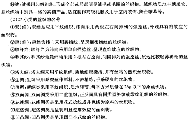 ⑤纺;纺采用平纹组织,经纬一般不加捻,是表面细洁缜密的丝织物。纺也叫纺绸。是丝织物中生产工艺为简单的一种。适宜作普遍夏季服装的面料及高级套装的里料和肥料。