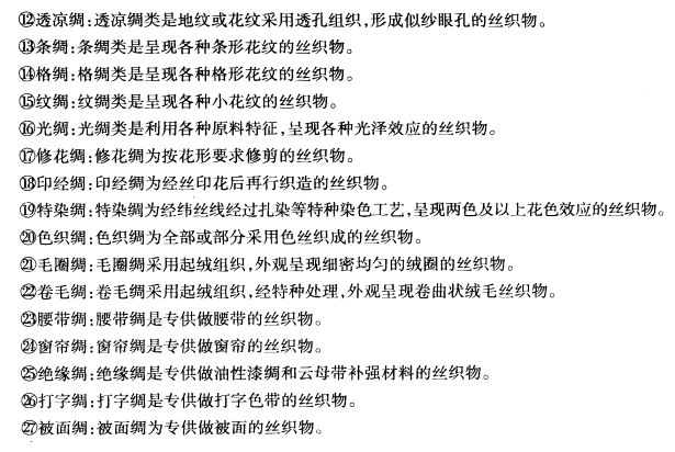 ④绢:绢以平纹或变化平纹为主体,平整挺括的色织或色织再会染的丝织物。质地细洁,可用于制作服装。