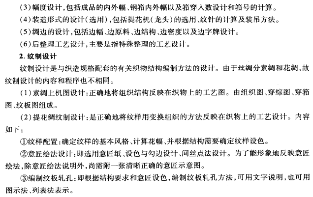 根据织物的用途以及流行的趋势,针对不同对象、不同季节和风俗习惯,进行选用原料、制定织造规格、组织设计等工作。是一项综合多种知识,把高度的艺术性和技术性融为一体的复杂工作。品种设计可归纳成工艺设计和纹制设计两大部分。