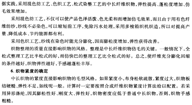 中长纤维织物要求有仿毛感的风格,应选用粗而富有弹性的纤维趋向纱线表面的分布。因此,涤腈混纺时,腈纶相对蓬松,在选用时应比涤纶粗短一些;涤粘混纺时,因粘胶纤维不耐磨,弹性差,所以应细长一些。