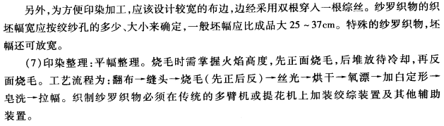 (2)涤/棉纱罗织物:经纬纱线密度比纯棉纱低20%—30%,以保持织物良好的透气性。