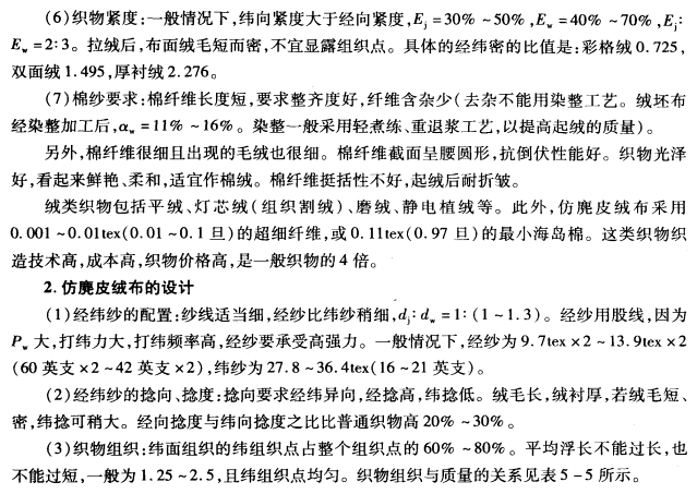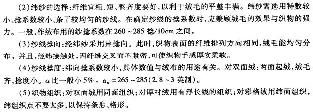 (1)按织物生产工艺,可分为白织绒布和色织绒布。白织绒布可分为平纹绒、斜纹绒和哔叽绒。色织绒布可分为条绒格绒、芝麻绒、厚衬绒和双纬绒。