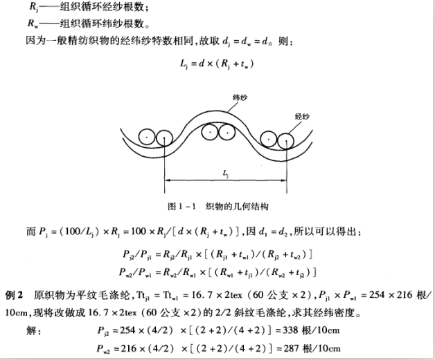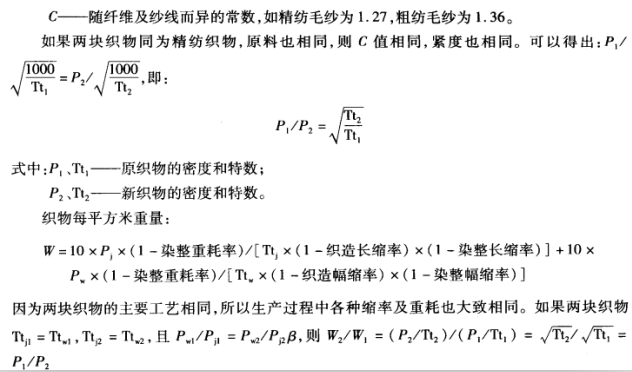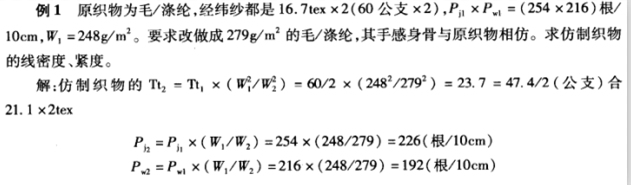 所谓相似织物就是指两块织物的品种相同,手感身骨相仿,而要求更改织物的重量。这样,两块织物的原料相同,主要工艺也相同,即可根据原织物的数据计算新织物的纱特与密度。