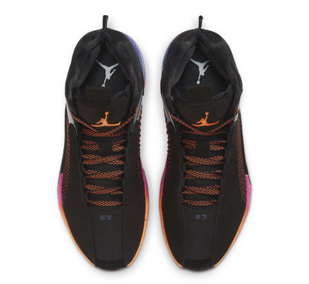 Jordan Brand 以“夕阳”为灵感,为 Air Jordan 35 打造一款全新配色。该鞋款配色采用绒面革和网眼织物制成,全黑鞋面搭配橙色细节点缀,再搭载模仿日落景象的渐变泼墨中底设计,吸睛度爆棚。