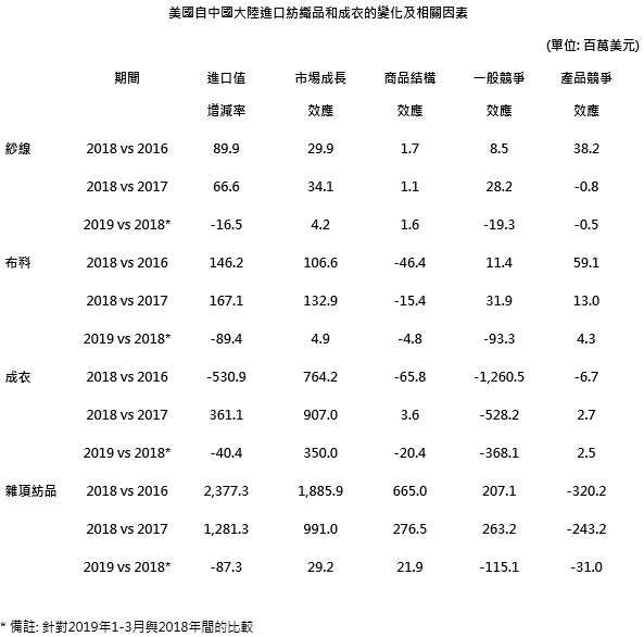 CMS模式结果显示,即使在关税战前,中国成衣出口竞争力也在减弱当中,这是导致2016-2018年期间中国输美成衣减少5.3亿美元重要的因素。同样地,该种竞争力衰退导致,2019年第1季中国输美成衣,与2018年同期相比,减少3.68亿美元。