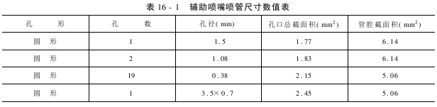 辅助喷嘴由管座1、管套2及喷管3等组成。其中喷管头端压扁成形,喷孔位置在与管身呈α角的斜面上,α称为喷射角;喷管与管套一般用树脂胶固结,两者按一定的角度β定位。称为喷向角,如图16-1所示。