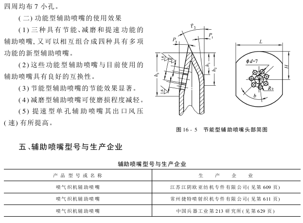 从生产实践角度看,各种孔形的辅助喷嘴的气流性能各有千秋,但也确有差异;它表明世界上各喷气织机制造厂家对喷气引纬技术的应用有所不同,体现自有的价值。如亚洲产的喷气织机多采用单孔或双孔的辅助喷嘴;而欧洲产的喷气织机则多采用多孔或非圆形孔的辅助喷嘴。几种常见的辅助喷嘴进行测绘所得的数值有见表16-1,供参考。