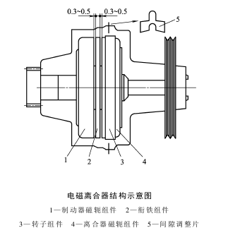 离合器是磁轭通电产生电磁力吸合衔铁、衔铁与摩擦片产生摩擦力来传递动力,所以衔铁与转子摩擦片间隙务必要调整在0.3~0.5mm之间,可用间隙调整片5(图18-1)调整到佳位置。