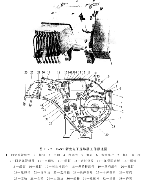 以FAST电子选纬器为例说明电磁式选纬装置的工作原理。该电子选纬器上装有多根选纬指,可选择多种纬纱,电子选纬器根据电子讯号控制选纬次序。