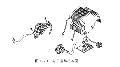 它由一个独立模块驱动,每一个模块都由一个独立步进电动机和选纬指组成,多可达八色,由于它可由织机微电脑控制,所以可以与织机速度和纬循环同步,纬纱运行平直,可保持恒定的低张力,可设定好的穿纱位置,模块可以互换,由于没有机械运动,所以无需润滑保养,可更适应高速化(图11-1)。