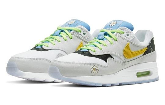 Nike 全新小雏菊系列,Air Max 1 以白色和浅灰色为主调,织物材质打造鞋面,鞋身两侧的 Swoosh 以亮黄色灯芯绒点缀。