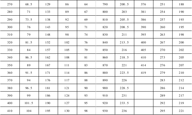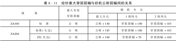 经纱穿筘筘幅一般应小于或等于织机的经纱大穿筘筘幅,经纱大穿筘筘幅和织机公称筘幅的关系见表8-11(以津田驹织机为例)。