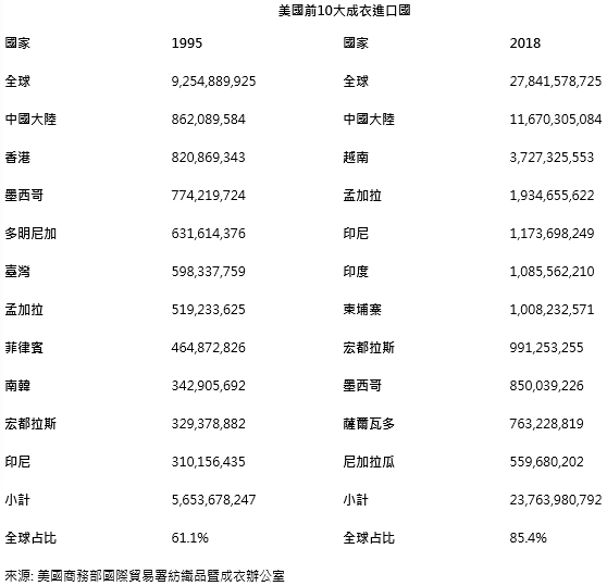 透过美国进口统计数据,我们可以清楚地看到此一现象。WTO于1995年成立以来,美国10大成衣进口国占全球输往美国成衣进口总额的61.1%。2018年此一数字已跃升至85.4%。许多曾被列为十大供应国都发生变化: