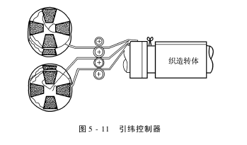 在引纬控制器和纬纱通道之间有纱线夹持器和主剪刀。夹持器可使每一根纬纱停止引入,受控的主剪刀适时将其切断。如引纬有误,则机器自停,以便处理纱疵(图5-12)。