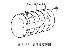 在转动滚筒梭口上同时引入四根纬纱,要有数项关键技术才能实现(图5-10)。引纬元件,即引纬控制器与转动滚筒为同轴心回转盘,用以分配和导入纬纱。引纬控制器(图5-11)由两个圆盘、多通道系统组成。由压缩空气传输的纬纱离开导入通道依次进入相应的纬纱通道。引纬控制器也有主喷嘴功能。