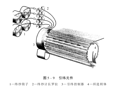 四根纬纱由计长罗拉以恒定速度从固定纬纱筒子上引出。其速度取决于引纬速率及织造幅宽,1/4的入纬率由计长罗拉的速度控制。当引纬速度为5000m/min,纱线速度大约为20m/s。