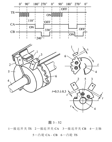储纬头的动作,应与织机的启动与停止同步。当织机启动后,运转至喷嘴出水的角度时,储纬器的指棒(电磁钩)抬起,同时压纱器也松开,喷嘴内的水流将纬丝带出,完成引纬过程。当纬丝飞行到头后,指棒放下,压纱器闭合,避免纬丝松弛。这里指棒与压纱器的吸合或断开都与织机的运转角度有密切关系。所以储纬器必须要求织机提供运转信号及基准信号,A储纬器信号、B储纬器信号。上述信号一般使用三只接近开关控制。其安装调试方式见图3-52。
