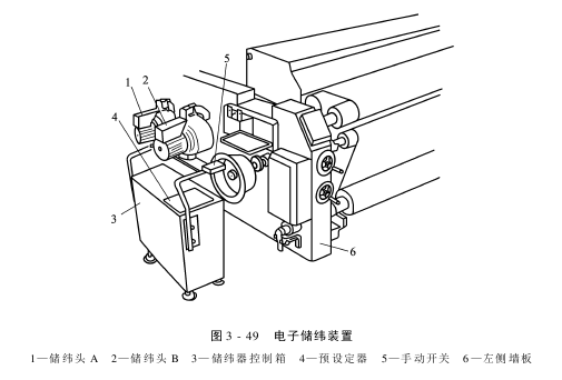 电子储纬装置通常由储纬头、控制箱、预置器及手动开关组成。详见图3-49。