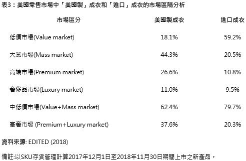 如表3所示,以美国整体成衣零售市场为例,针对高端成衣或奢侈品成衣市场,”美国制”产品的占比接近40%,而进口品仅占20%。相反地,”美国制”产品在低价市场中仅占18%,而进口品在该市场约占60%。总体而言,似乎美国时尚品牌和零售商有计划性将”美国制”成衣定位于价格敏感度较低的市场,以平衡高昂的国内生产成本。