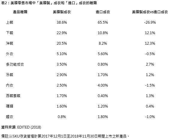 如表2所示,在过去12个月,”美国制”成衣更注重以”时尚为导向”的产品,特别是下装部分(如裙子、牛仔裤、裤子)、洋装、多功能服装(如运动服、工作裤)、泳装、西装套装。这些产品竞争优势越来越依重于独特的设计、高质量和加速上市,这使得采购自美国本土可获得商业利益。相比之下,进口产品主要都集中在有价格竞争力的时尚基本款上,包括上衣(如T恤、polo衫)、内衣、睡衣。
