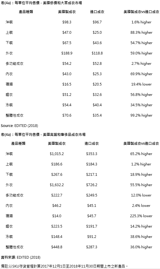 另一方面,在产品层面,除了袜类产品外,几乎所有主要类别的”美国制”成衣价格仍高于进口成衣(表4a和4b)。值得注意的是,在过去12个月中,在低价和大众市场中的”美国制”成衣的每单位平均售价比进口成衣高出99.2%;在高端和奢侈品市场则高出36%。此一有趣的现象支持”美国消费者愿意为“美国制”卷标的产品支付较高费用”的论点。