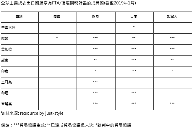 成衣企业普遍采用降低进口税成本的策略是自自由贸易协议(FTA)的成员国或享有贸易优惠计划【如普惠制, Generalized system of Preferences(GSP)】进行采购。如下表所示,特别是位于欧盟和日本的成衣企业有很多机会自世界主要的免税成衣生产据点进行采购。相比之下,美国与一些主要的成衣出口国签订自由贸易协议和贸易优惠计划较少—这使得美国时尚品牌和零售商更难享受到贸易协议提供的优惠关税好处。