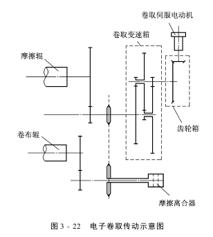 有的喷水织机已经采用了电子卷取机构。其结构原理如图3-22所示,其主要的特点是卷取机构由一个单独的电动机驱动,同原机械式卷取机构相比大大简化;调节纬密只需改变电动机转速即可;可通过编制织物组织程序,实时控制卷取电动机转速,织造变纬密织物;与电子送经联动,由织机电控系统统一控制,使织轴和卷布辊同步工作,相互匹配,用来消除由于经纱张力变化而造成的开车稀、密档,云织等织疵,提高织物质量,便于操作。