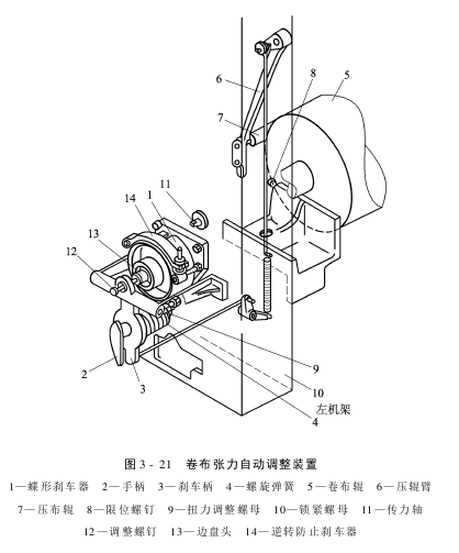 织机运转过程中,随着卷布辊外径逐渐增大,依靠卷取制动器的打滑作用,使卷布辊转速变慢,从而使织物保持一定的张力,如图3-21所示。其中,14为防倒转装置,用来防止织机在运转过程中因织物张力过大而引起的卷布辊倒转。通过调整手柄轴2与刹车柄3、扭力调整螺母9及锁紧螺母10可实现卷布张力的自动调整。