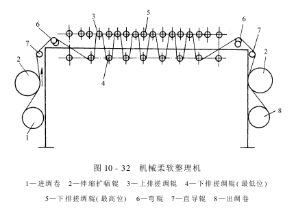 真丝织物机械柔软整理的方法较多,可在单辊筒整理机上轻轧或在拉幅机上轻微拉幅,也可用专用的机械柔软整理机,如图10-32所示。