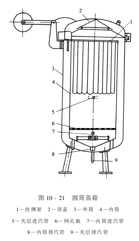 圆筒蒸箱是丝织物印花常用的一种间歇式蒸化设备,主要由外筒、内筒、夹层蒸汽管、筒底层直接蒸汽管、挂绸架、顶盖等组成,结构如图10-21所示。