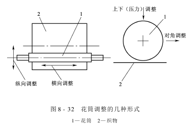 (3)对花装置:对花装置可使安装在网架上的所有圆网迅速组成一个完整的图案花型,对花装置具有纵向、横向和斜向(对角)三种调整机构,如图8-32所示。