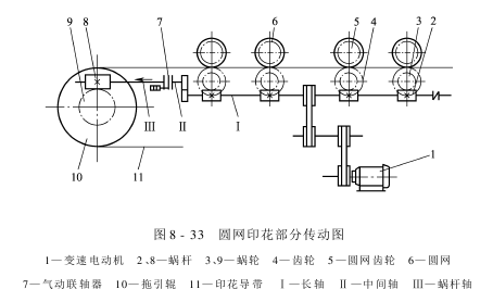 (5)圆网与导带的传动装置:圆网与印花导带是连续运行的,传动比平网印花机简单。为保持圆网与导带同步传动,圆网与导带由同一电动机拖动。其传动系统如图8-33所示。