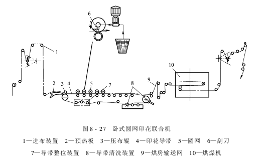 图8-27所示为卧式圆网印花联合机的一种。其基本组成与自动平网印花机相似,由进布装置、印花单元、热风烘燥和出布等主要部分组成。只是间歇升降运动的平版筛网改换成连续回转的圆筒筛网,导带间歇运行变为连续运行。印花单元是圆网印花机的核心部分,主要由贴布装置、刮印机构、对花装置、导带整位装置、圆网和导带传动装置、导带清洗机构等组成。
