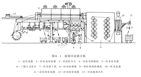 滚筒印花机必须与其他单元机和通用装置组成印花联合机,如图8-1所示。它主要由进出布装置、印花车头、热风预烘机、烘筒烘燥机、传动装置等组成。