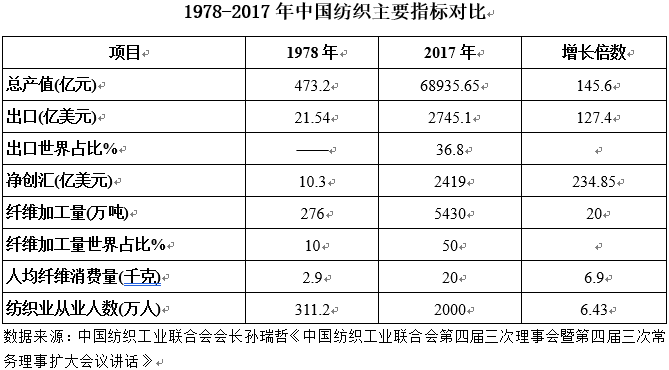 1978年-2017年中国纺织工业总产值从473.2亿元猛增到68935.65亿元,增长145.6倍;出口从21.54亿美元增到2745.1亿美元,增长127.4倍,纺织品出口占世界纺织贸易的36.8%;净创汇从10.3亿美元增长到2419亿美元。(编辑:DYL)