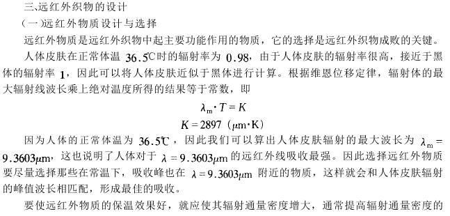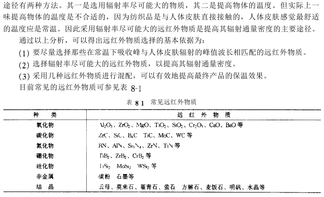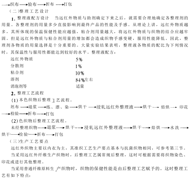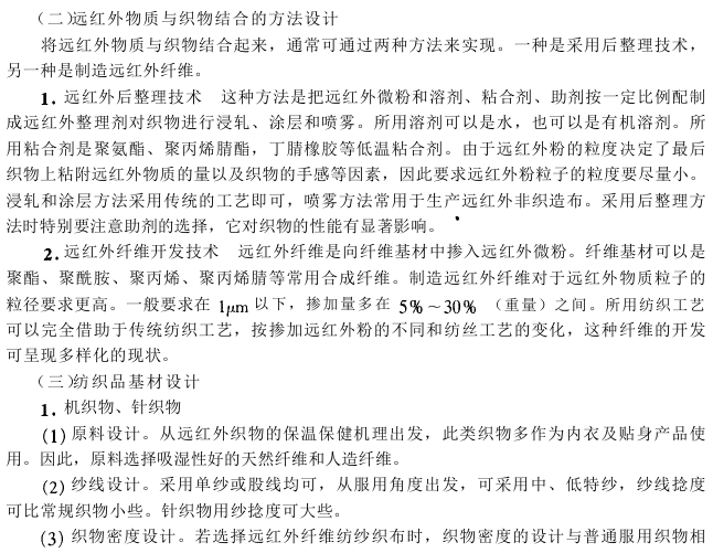 2.向功能新型化发展 传统的远红外纺织品通常是以织物或纺丝原液为基材,加入远红外辐射物质。如今正在向突破这一格局的方向发展,在远红外的基础上再发展新的技术生长点。例如可以在产品中掺入一些稀有放射性元素矿石微粉,产生负离子效应。这种新型的远红外织物将是远红外纺织品发展的一个方向。