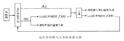 远红外物质通过吸收太阳光中的远红外线,将其转化为自身的热能储存起来。根据基尔霍夫定律和斯蒂芬一玻尔兹曼定律,好的吸收体也是好的辐射体,温度高于绝对零度的物体都能不断辐射能量。因此远红外物质除了强烈地吸收太阳光中的远红外线之外,也不断地积极向外辐射远红外线。人体也是远红外线的敏感物质,对远红外线具有强烈的吸收作用。当人体皮肤遇到远红外物质辐射出的远红外线时,会发生与振动学中共振运动相似的情况,吸收远红外线并使运动进一步激化。转化为自身的热能,皮肤表面的温度就相应升高。这样,远红外织物就通过远红外物质达到了积极的保温作用。从下图可以直观地看出远红外织物的保温机理。
