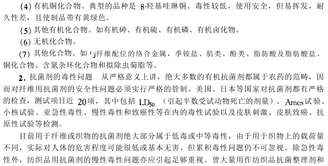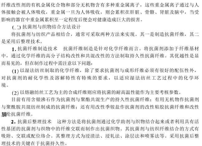 抗菌织物发展于20世纪初期,第二次世界大战以后,美国、日本等国家先后投入大量资金和人力,进行抗菌织物的研究。自80年代以来,开始出现通过化学纤维的高分子结构改性和共混改性的方法制取持久性抗菌纤维的方法,其中以共混方式为主。早期用于化纤共混纺丝的抗菌剂一般均为含金属离子的复合物,其中有不少抗菌剂含有重金属离子近年来随着人们环境保护意识的增强,重金属离子对人体的生态毒性问题已逐渐引起人们的重视,抗菌效果好但毒性较大的含重金属离子抗菌剂已被逐渐淘汰,取而代之的是以与银离子结合具有抗菌性的沸石作为与合成纤维共混改性的主要抗菌剂,这种抗菌剂有广谱抗菌效果,对人体无害,而且热稳定性好。近10年来,抗菌效率更高、使用更为方便、安全性更好的抗菌整理剂不断涌现,并在实际应用中不断被筛选。