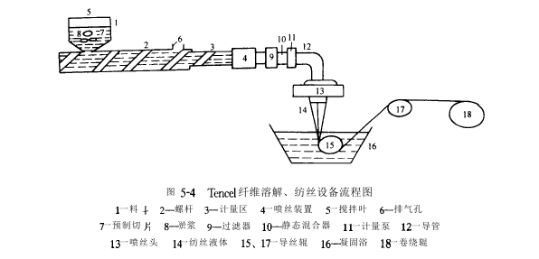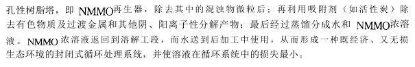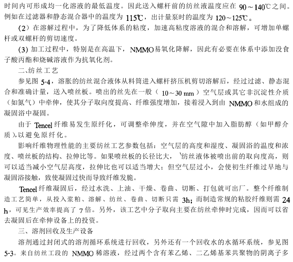 Tencel纤维的生产工艺与粘胶纤维生产工艺相比,不需要经过化学反应,纤维素分子避免了因化学反应而引起的降解。此工艺为:首先将木浆粕溶解在NMMO溶剂中,并除杂过滤;接着采用干喷湿纺工艺进行纺丝;然后对丝进行水洗、干燥、卷曲和切断,同时将几乎100%的NMMO溶剂回收后再利用。工艺流程如图5-3所示。