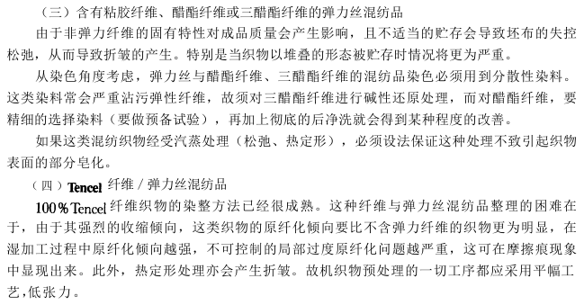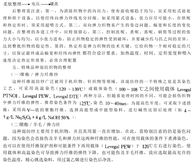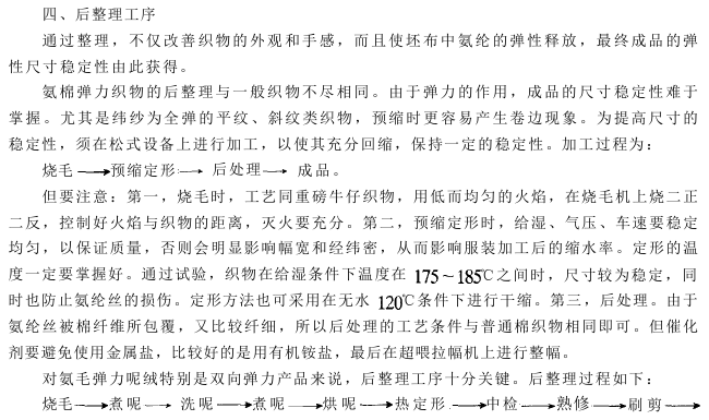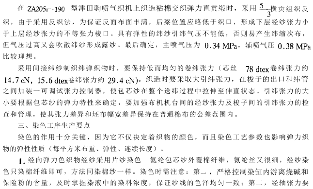 纬向弹力织物的经向工艺与纯棉浆染色工艺相同。经向和双向弹力织物的工艺路线如纬向弹力织物的经向工艺与纯棉下: