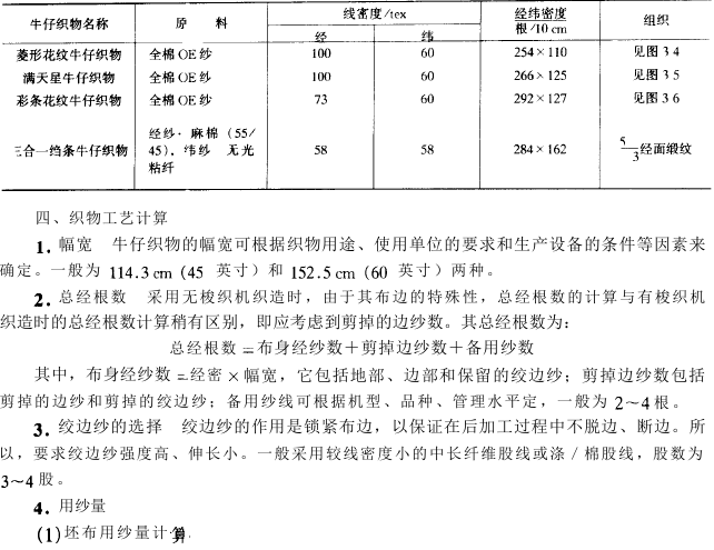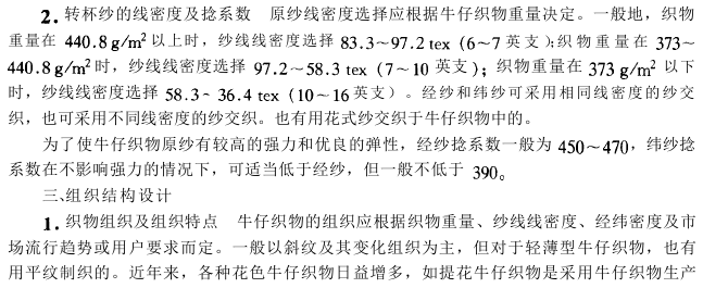 有用48tex*48tex丝转杯纱织成的牛仔绸,以及用45tex麻/棉(55/45)混纺纱作经纱,用125tex兔毛纱(40%)和107tex涤纶空气变形丝(60%)交并作纬纱织成提花牛仔织物,其手感丰厚、毛型感强。