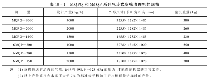 国产MQPQ系列和6MQP系列的气流式(离心式)皮棉清理机的规格见表10-1。