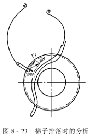 即棉子在棉子梳处与锯片侧面接触后的动量是Pt和mv0的合成。mv0近乎是常量,棉子上含纤维越多,mv受Pt的影响越大,棉子被抛得越远,终落在离棉子梳较远的轧花肋条上部较平坦的部位。反之,棉子上含纤维越少,mv受Pt的影响越小,棉子被抛得越近,终落在离棉子梳较近的轧花肋条下部较陡的部位。