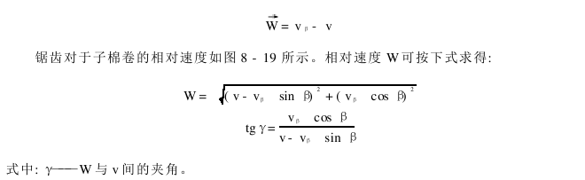 这样,处在子棉卷中的单粒子棉一旦与锯齿接触,子棉上的纤维就以速度W进入锯齿凹口。现在,很容易证明锯齿对子棉的种作用。在丁区,vβ 的数值较大,且β角小于90°。v的数值是个常量,故W的方向必然指向锯齿凹口,即在丁区,锯齿使纤维进入齿凹的作用较强烈,锯齿在此区的勾棉能力强,勾棉数量多。在戊区,尽管vβ 的数值大,但β角近似90°,使γ角很小,甚至为零,故W的方向就难以指向锯齿凹口,即在戊区,锯齿使纤维进入齿凹的作用甚微,锯齿在此区的勾棉能力很弱。在己区,因β角大于90°,故W的方向必然背离锯齿凹口,即在己区,锯齿无法使纤维进入齿凹。
