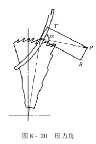 随锯齿向工作点移动的子棉,碰到轧花肋条排后立即改变运动方向和速度,沿着肋条排表面向上运动。子棉卷在该处的速度慢,为1.1~1.5m/s,但此时密度大。在轧花肋条工作点处,锯齿从棉子上拉脱纤维的能力与轧花肋条和锯片之间的相对位置有很大关系。轧花肋条与锯片相对位置关系,一般用压力角表示。压力角是轧花肋条工作点处的圆弧切线和锯片圆周切线之间的夹角,用字母α表示,如图8-20所示。