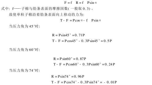 其中,P的方向与锯齿在工作点处的运动方向一致;R垂直于轧花肋条,是工作点处锯齿从棉子上拉脱纤维的力;T平行于轧花肋条,是工作点处锯齿推动子棉卷运转的力。在垂直于轧花肋条的分力R的作用下,子棉和肋条表面之间产生摩擦力F,F的方向与T的方向相反,其数值为: