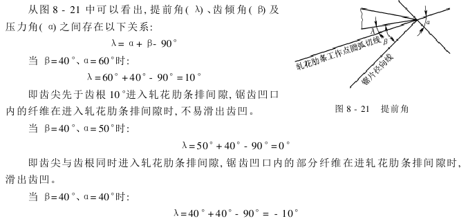 锯齿凹口内的纤维能否全部进入轧花肋条排间隙,在很大程度上取决于锯齿工作边和轧花肋条之间的相对位置。若齿尖先于齿根进入肋条排间隙,轧花肋条对纤维起的作用是将它们压向齿根,齿凹内的纤维能顺利进入肋条排间隙;反之,若使齿根先于齿尖进入肋条排间隙,轧花肋条将齿凹内的纤维推向齿尖,齿凹内的纤维不能进入肋条排间隙。锯齿工作边与轧花肋条之间的相对位置关系,一般用提前角表示。提前角是位于工作点处的锯齿工作边与轧花肋条工作点圆弧切线之间的夹角,用字母λ表示,如图8-21所示。提前角是指齿尖比齿根提前进入工作点间隙的角度.