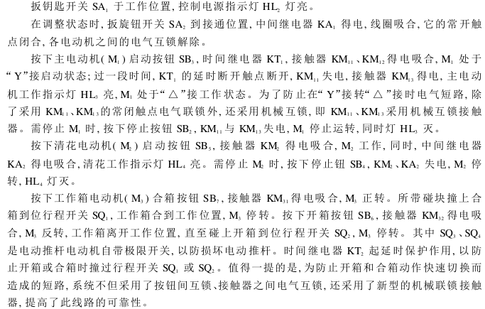 (1)设有状态转换开关。当打到试制状态时,各个电动机可以单独自由启动,若打到工作状态,就必须按一定的顺序启动。